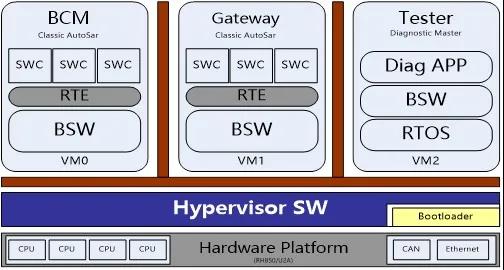 沒(méi)有一顆好大腦,再健壯的四肢也只能是擺設。為此,歐菲光采用了一顆高性能、大算力、多核的MCU大腦,并在底層軟件搭建Hypervisor(即虛擬機監視器),可允許多個(gè)VM虛擬機系統共享硬件,能讓集成系統“一心三用”,同時(shí)運行車(chē)身控制功能的 AutoSar系統、Gateway的AutoSar系統和運行診斷的RTOS系統三個(gè)獨立的VM虛擬機子系統,充分發(fā)揮各大硬件性能,高效智能掌控車(chē)身全域。